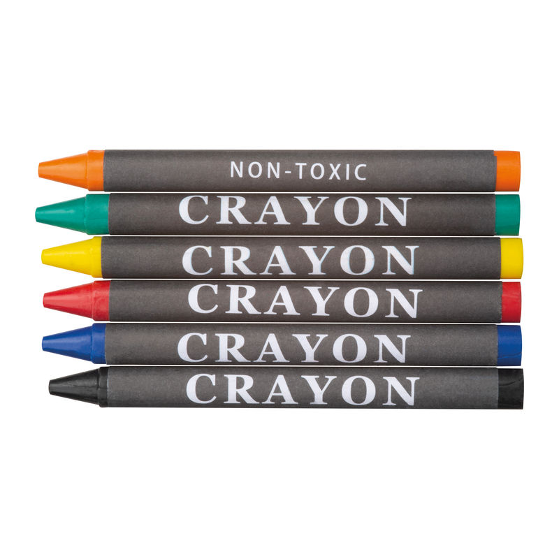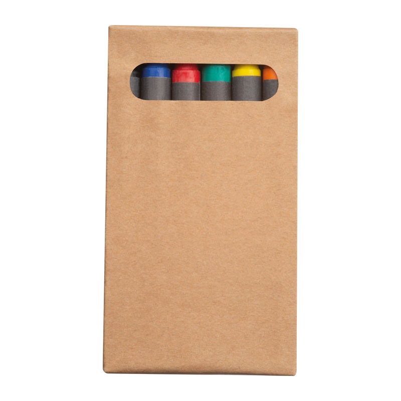 6-piece wax crayon set in paper packaging. We will print your logo on the packaging.