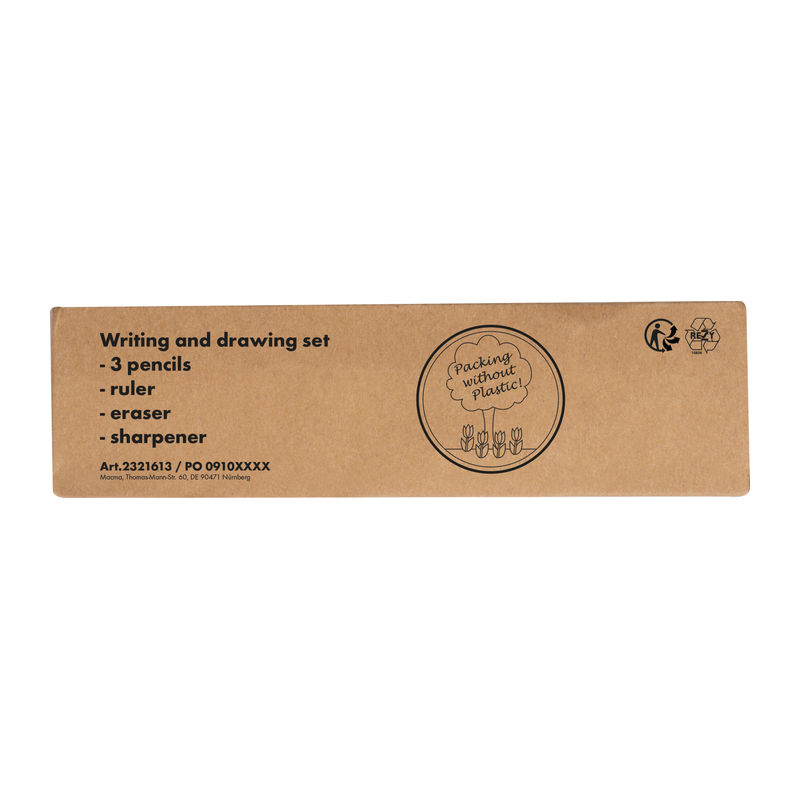 Writing and drawing set including 3 pencils with different degrees of hardness, ruler, eraser and sharpener. Your logo will be placed on the box.