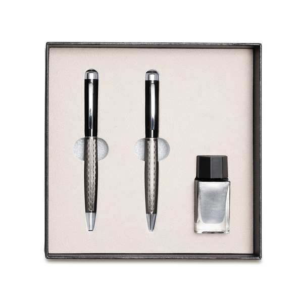 An elegant writing set consisting of a metal fountain pen, ballpen and a bottle of blue ink. Packed in a gift box.
