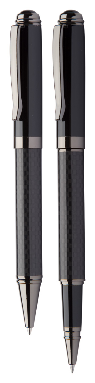 Elegant, metal ballpoint and roller pen set with pattern barrel. In black gift box, with blue refill. André Philippe brand product.