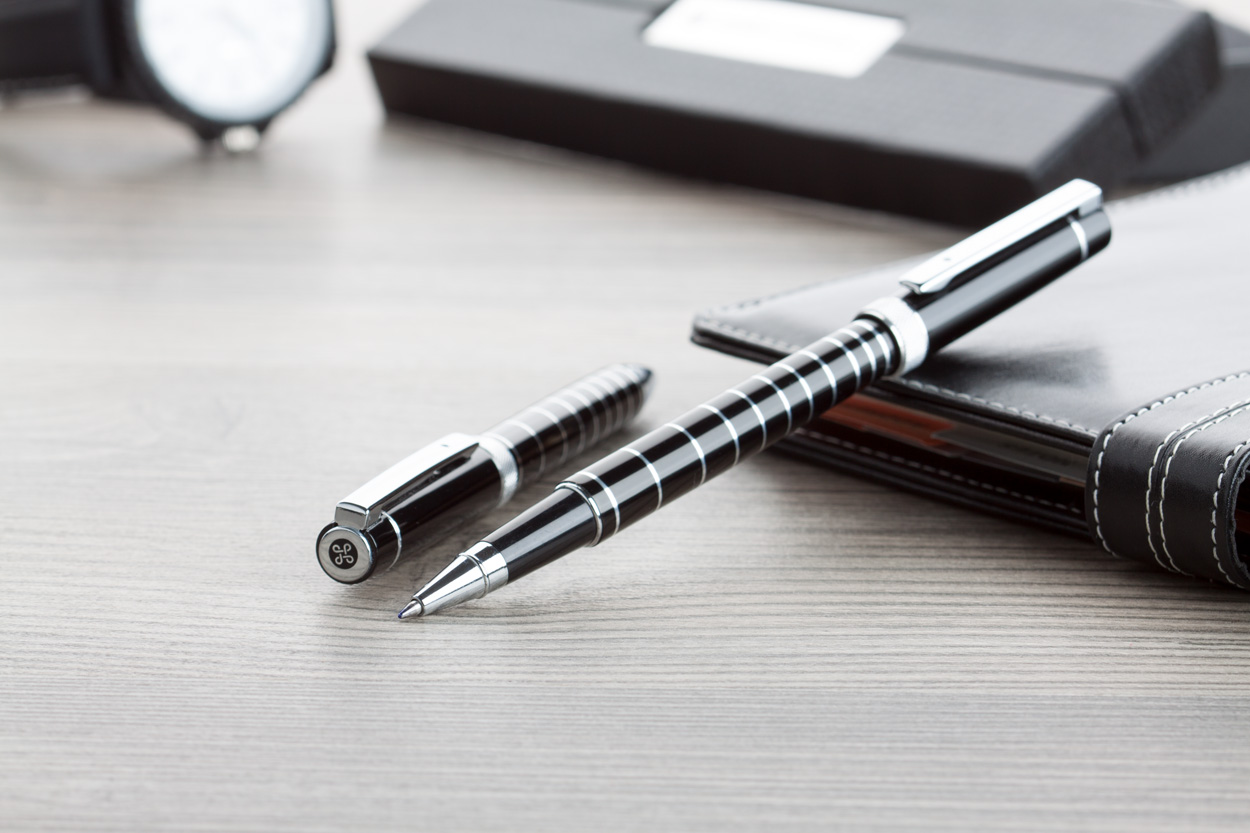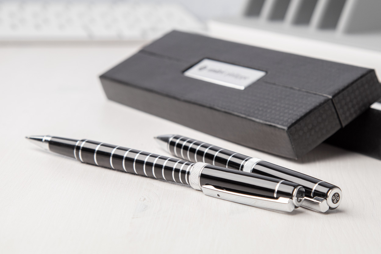 Elegant, aluminium pen set with ballpoint pen and roller pen. With shiny barrel and chrome rings. In black gift box with blue refill. André Philippe brand product.