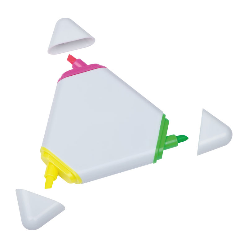 Triangular highlighter made of recyceled plastic in the colours yellow, green and pink. The triangle is ideal for your logo imprint.