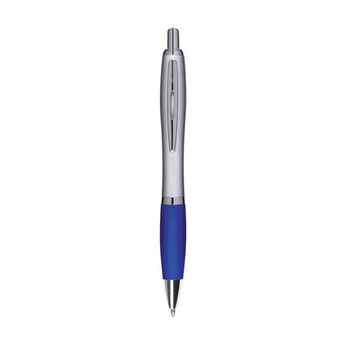 Blue ink ballpoint pen with coloured non-slip grip and metal clip.