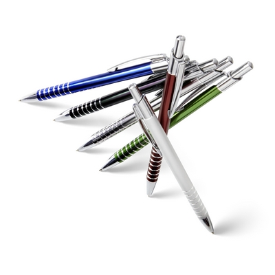 Ball pen with patterned grip and silver trim parts