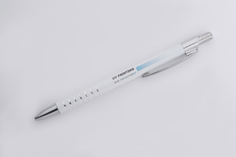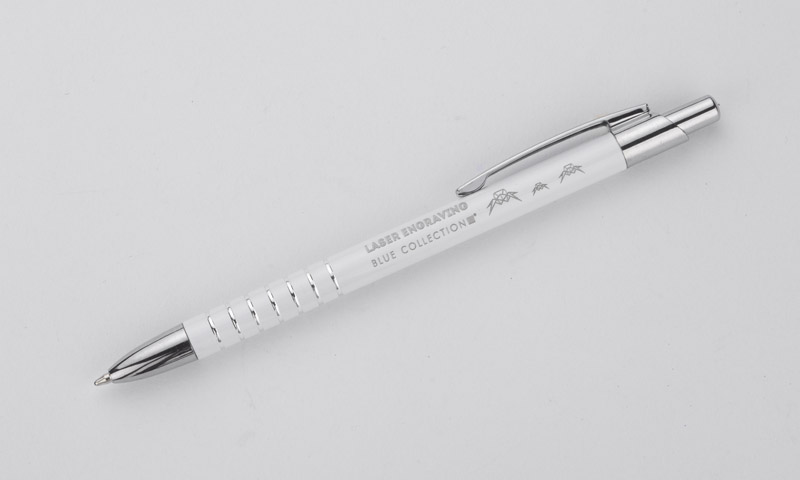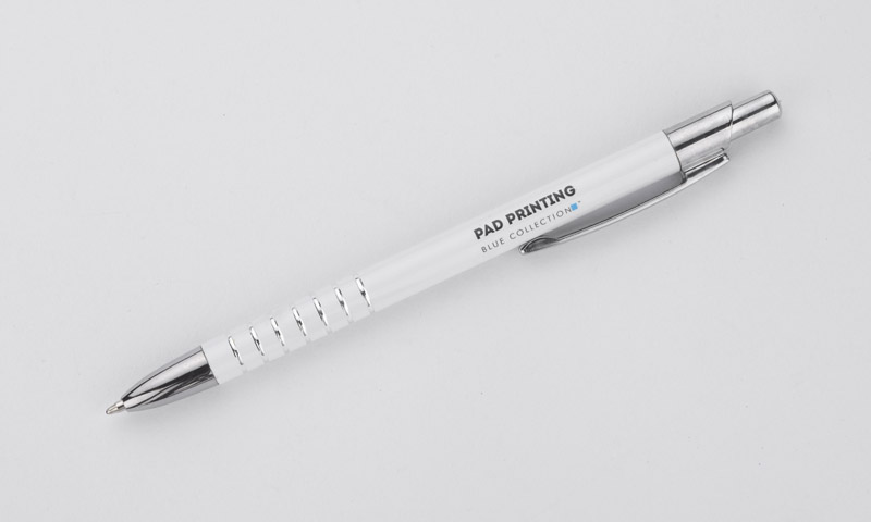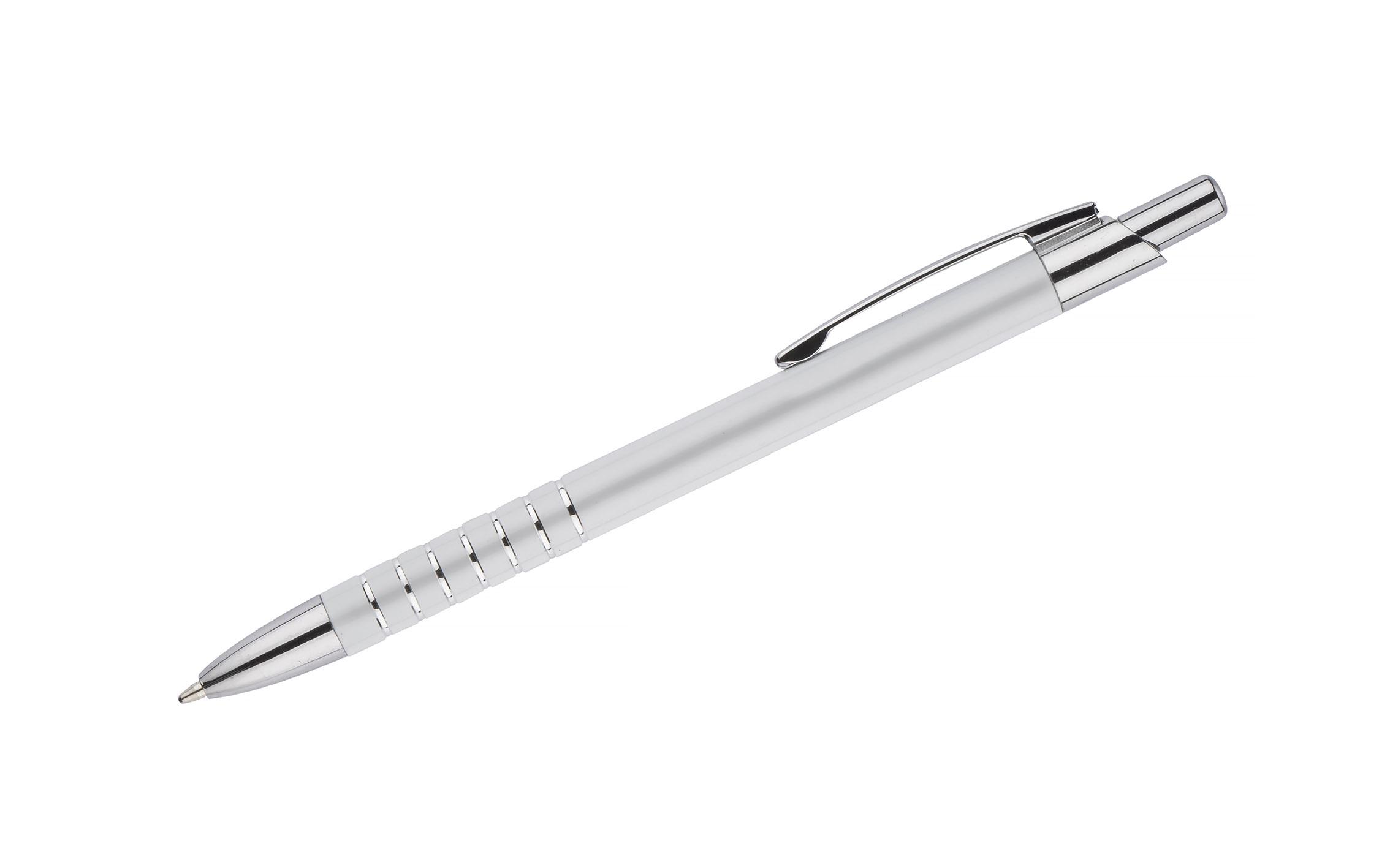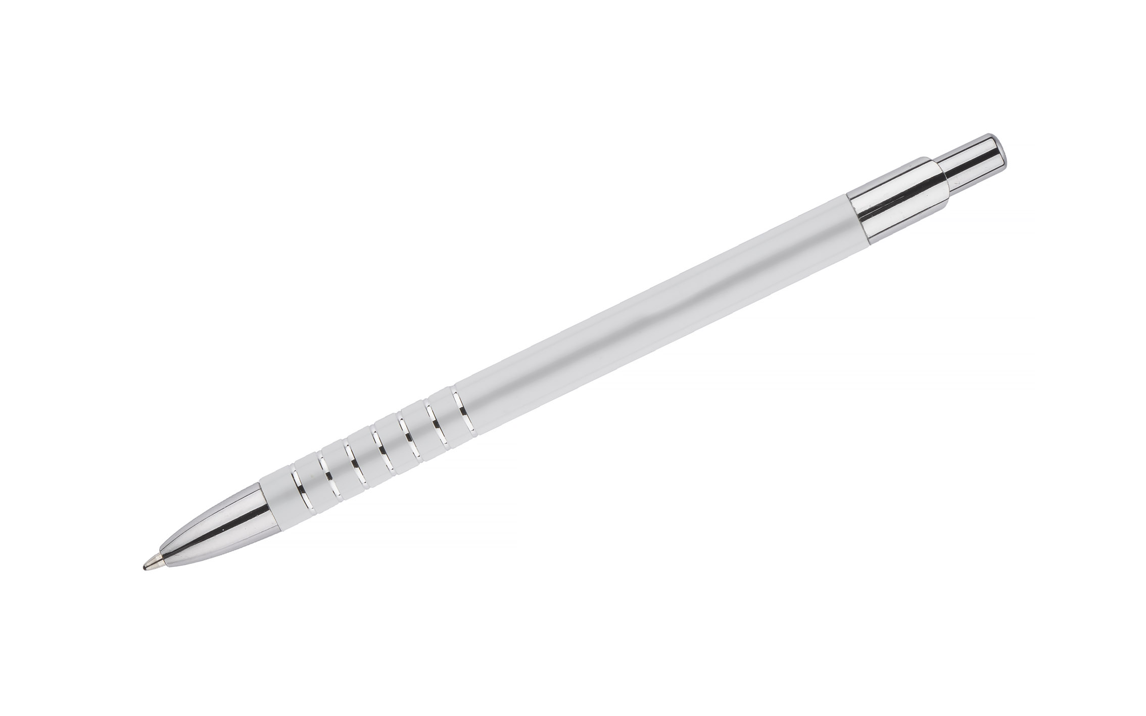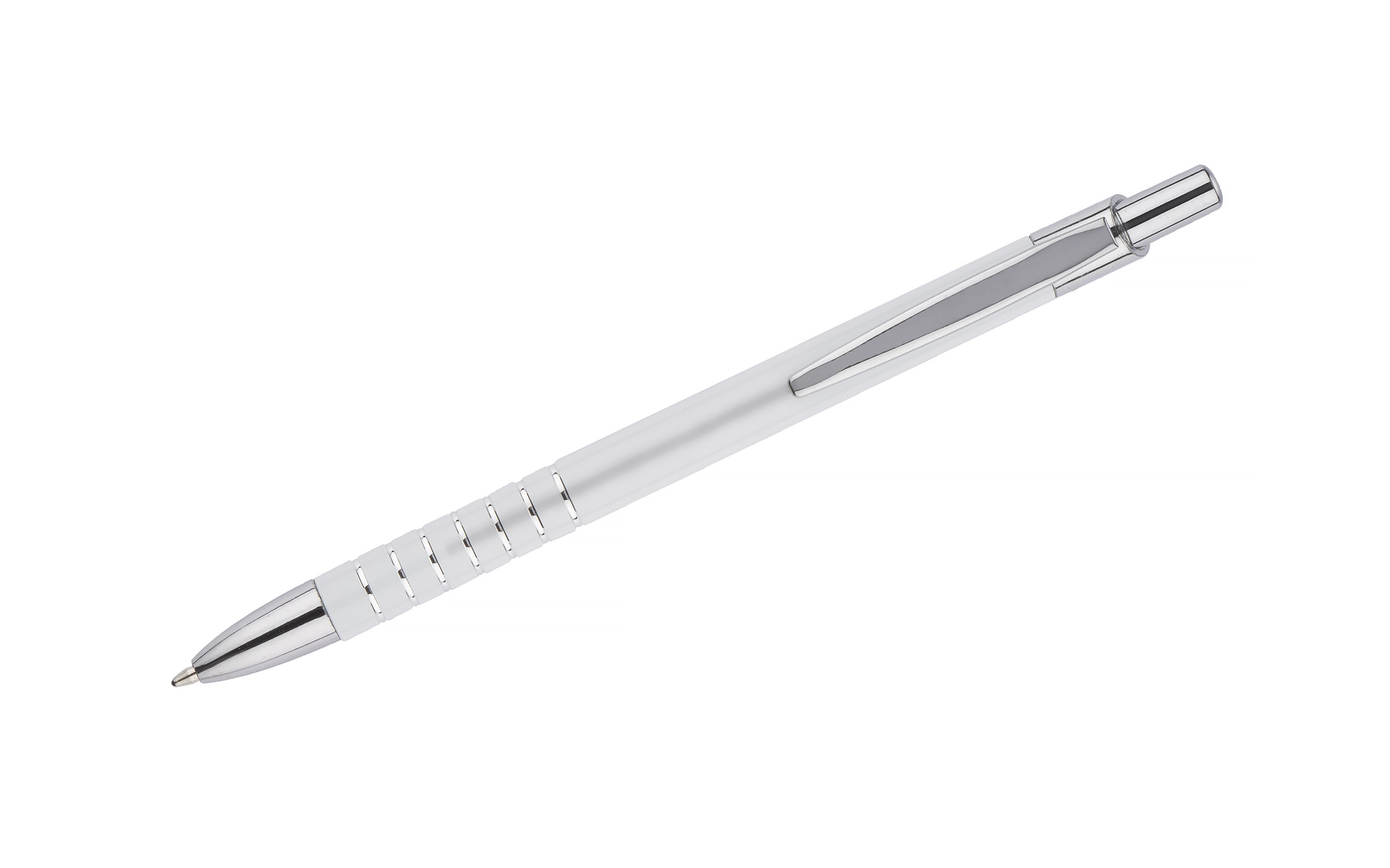 Simple ball pen made from aluminium, decorated with wide rings. Logo will be engraved.