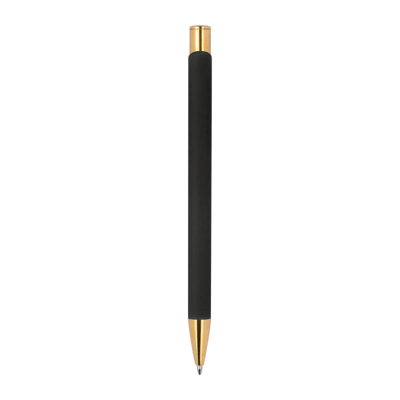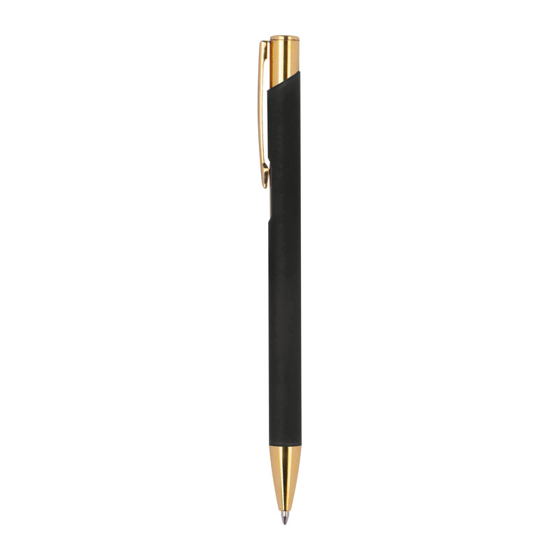 Ballpen crafted from aluminium with gold-coloured accents, a rubberised finish, and a large-capacity blue ink refill. The rubberised surface produces an elegant, gold-coloured logo image after engraving.