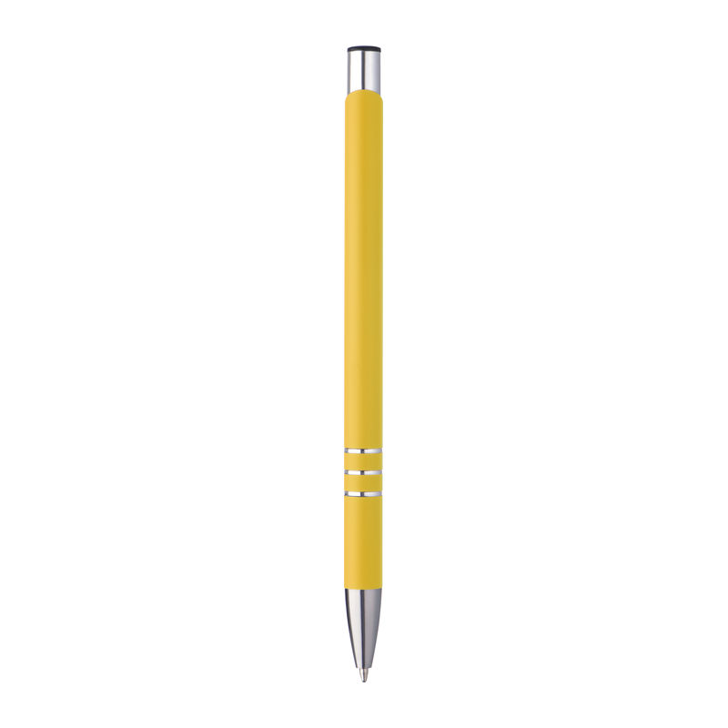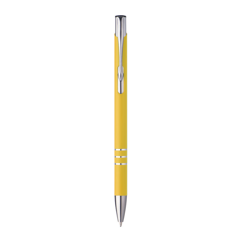 Slim, rubberised metal ballpen featuring a blue-ink plastic refill.