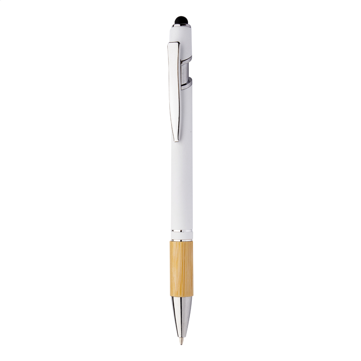 Aluminium ballpoint and touch screen pen with bamboo grip and rubberized finish. With special coating for mirror laser engraving. With blue refill.