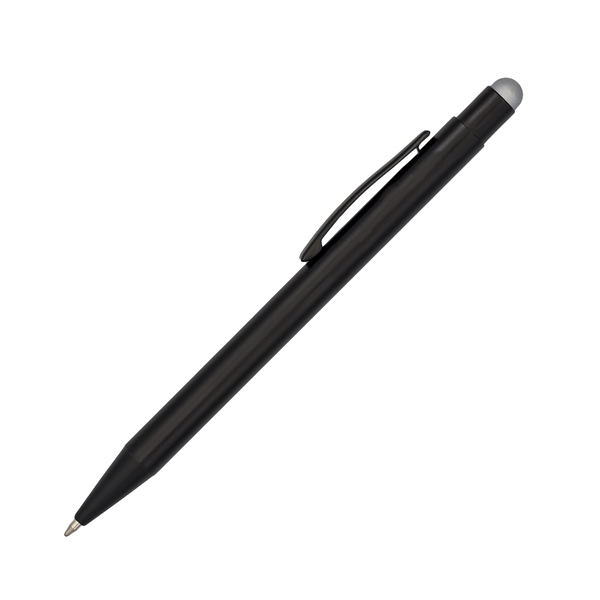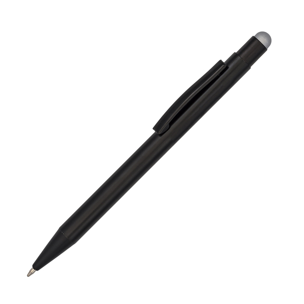 Ballpen with black body and colored tip for touch screens. With possibility of making a shiny logo in a color matching the color of the touch tip stylus. Blue refill.