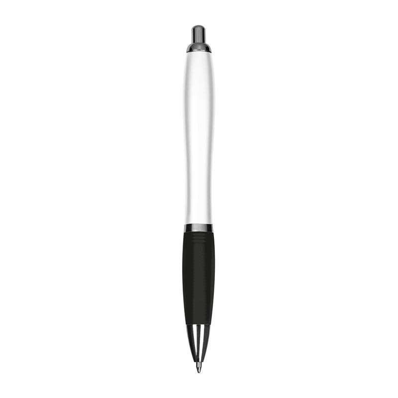 Plastic ballpen featuring a white barrel, metal clip, blue-ink large capacity refill, and a coloured rubber grip.