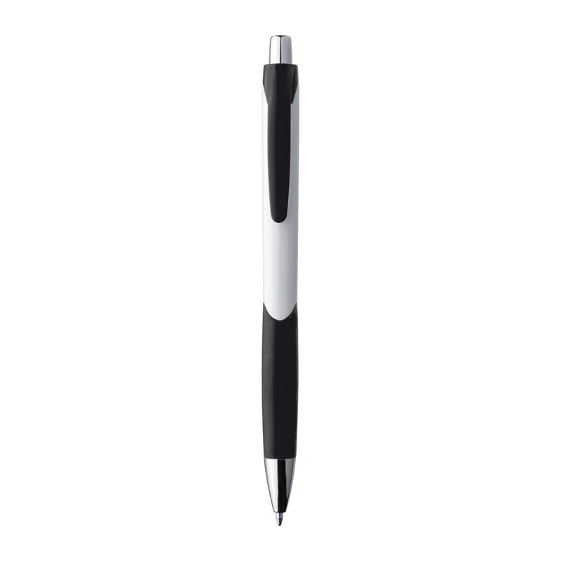 Ball pen with push mechanism, rubber grip zone, blue-writing refill, metal pusher and tip. We will print your logo on the shaft.