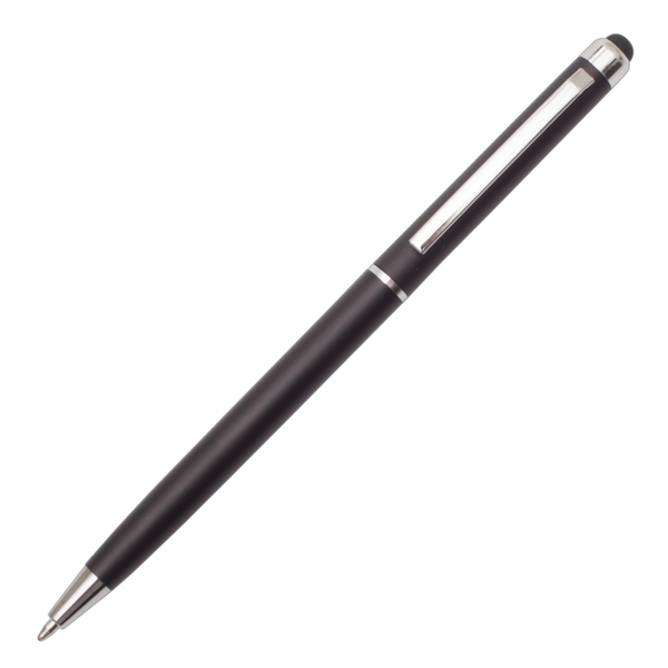 Plastic ballpoint pen with metal clip and stylus, blue refill.