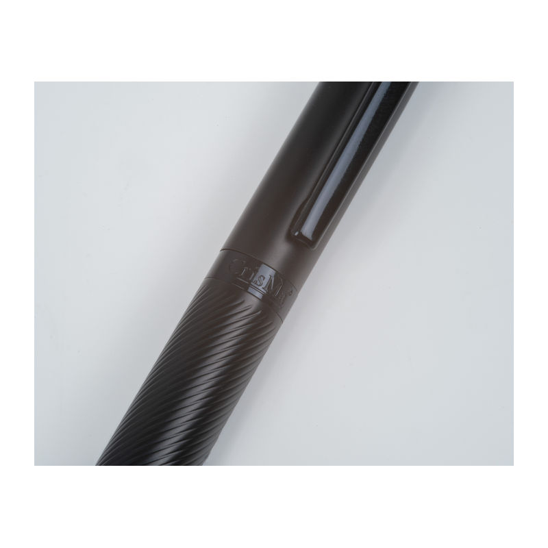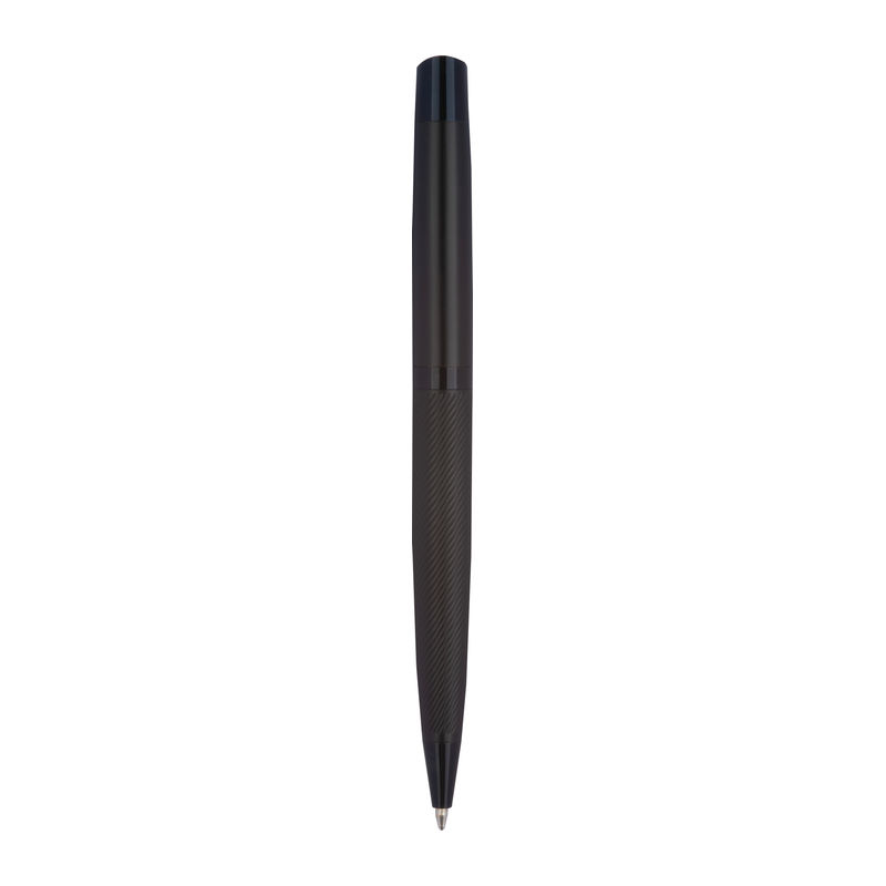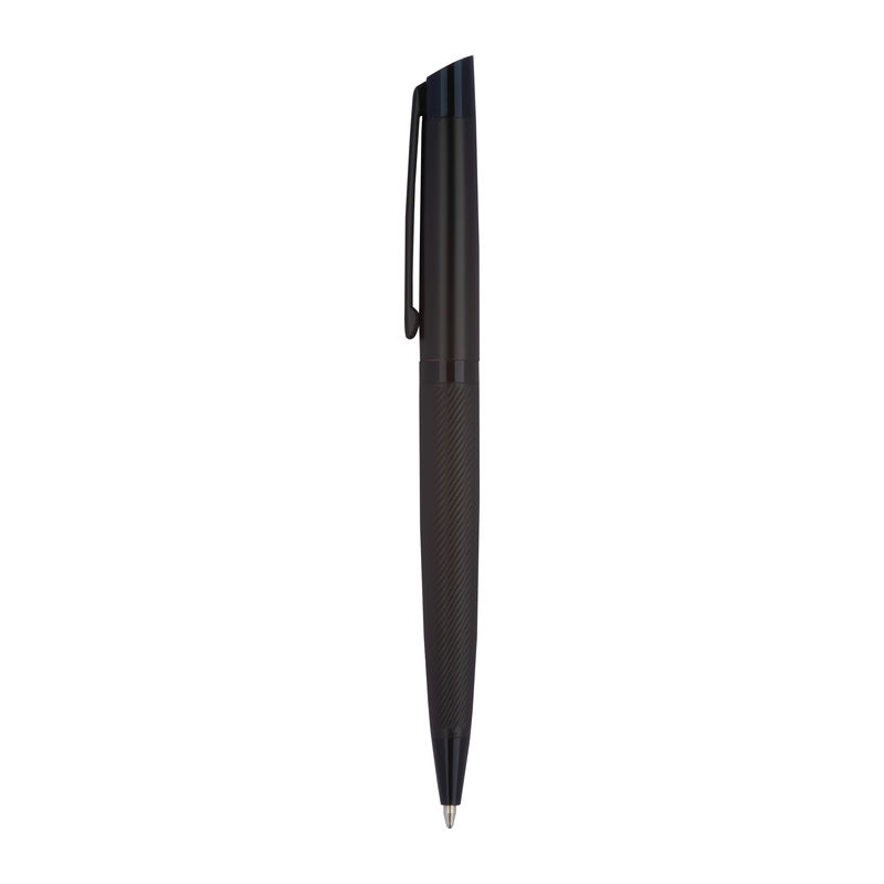 Black stainless steel twist action ball pen in matt design and large capacity refill with blue ink. Your logo is engraved to the right of the clip.