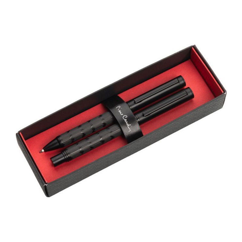 An elegant Pierre Cardin set of metal writing accessories. The pen bodies are designed in black with an imaginative structured design. The tip of the roller is protected by a cap in the colour of the pen, the ballpoint pen has a rotating mechanism. Roller contains a German Schmidt cartridge
