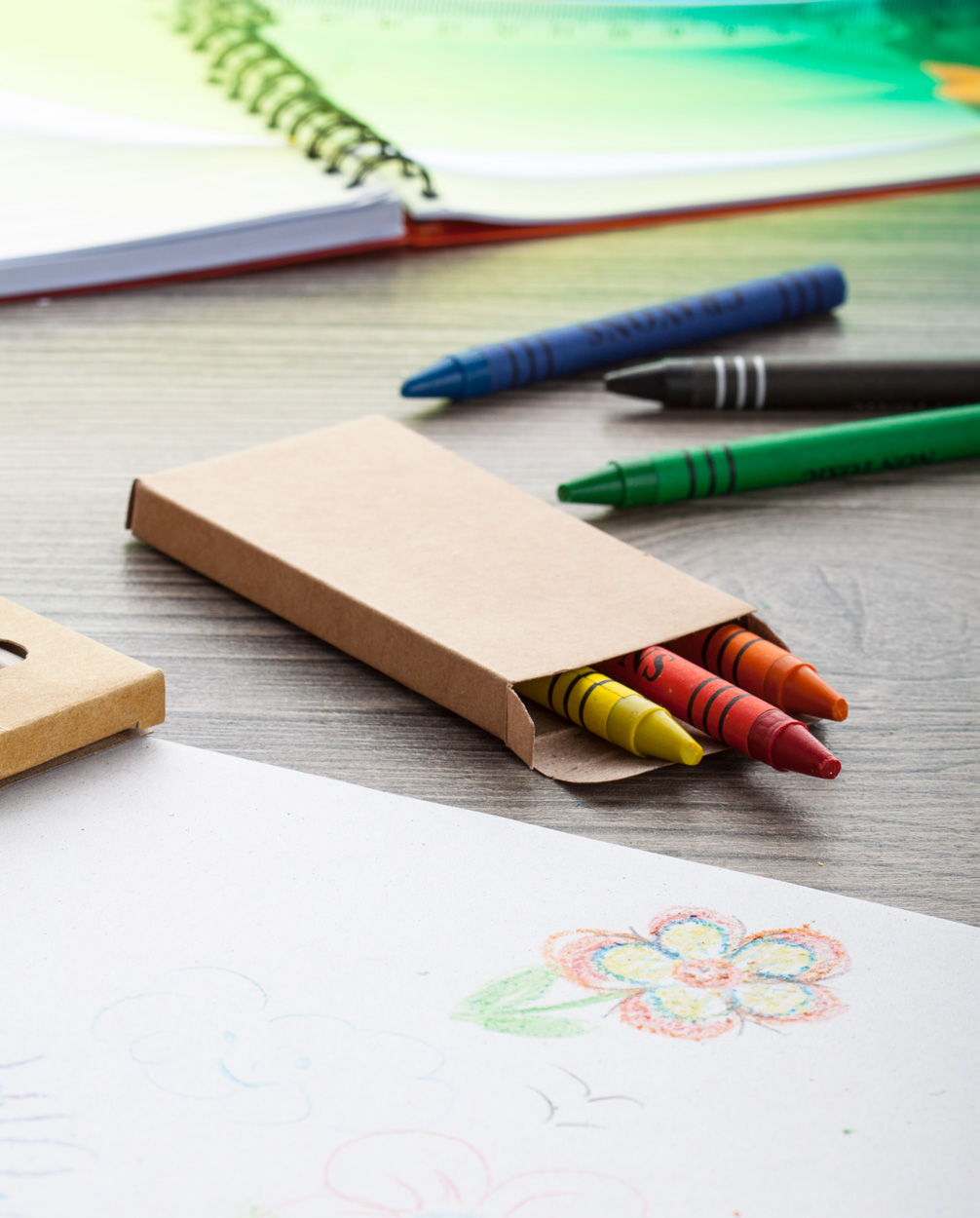 Black paper covered, coloured crayons (6 pcs) in paper box.