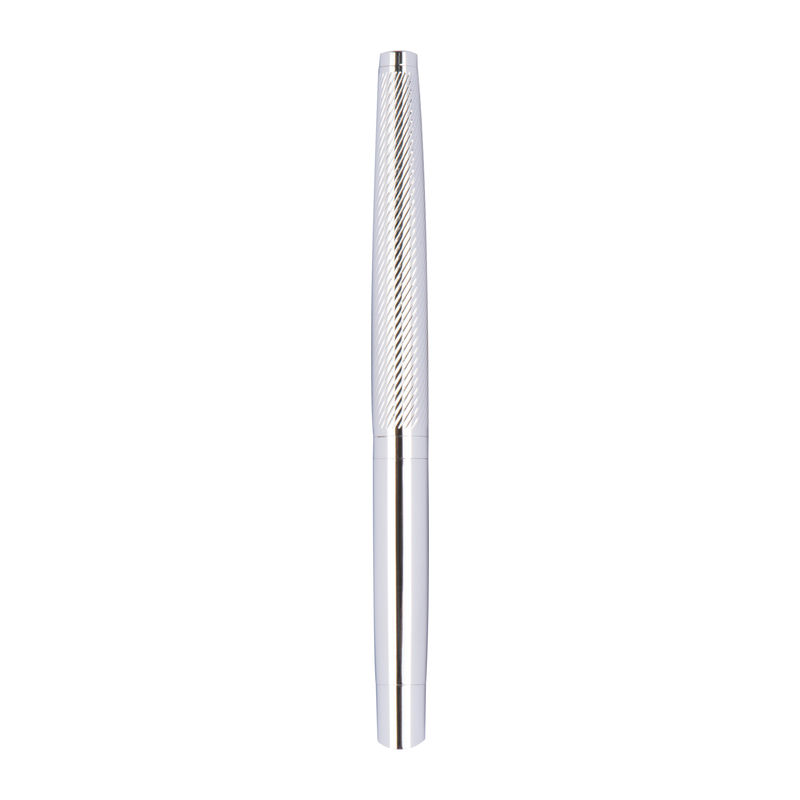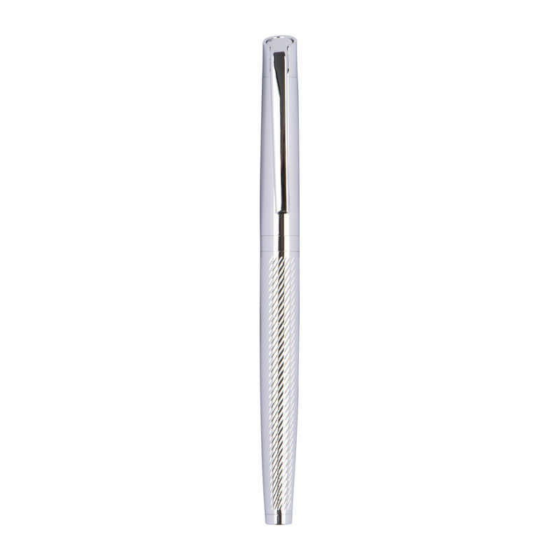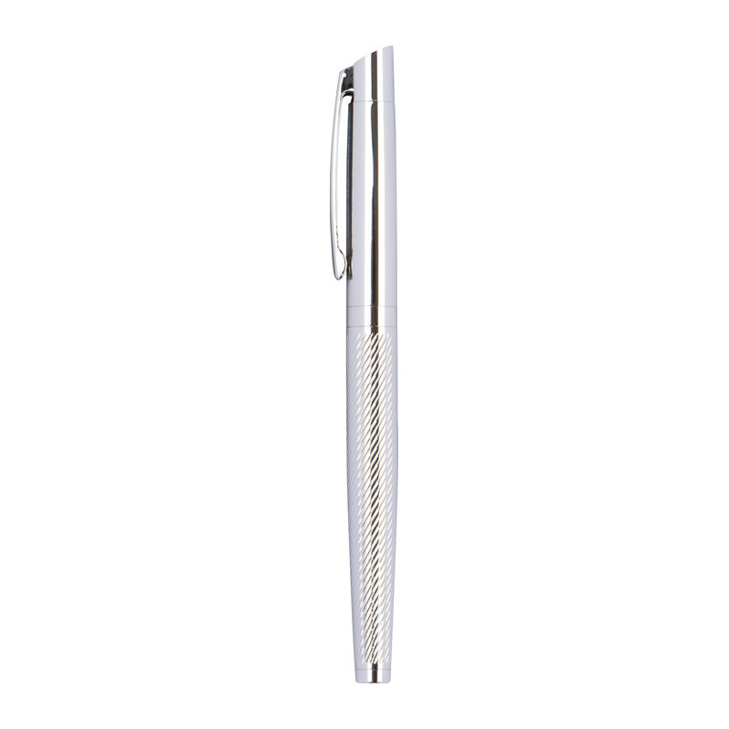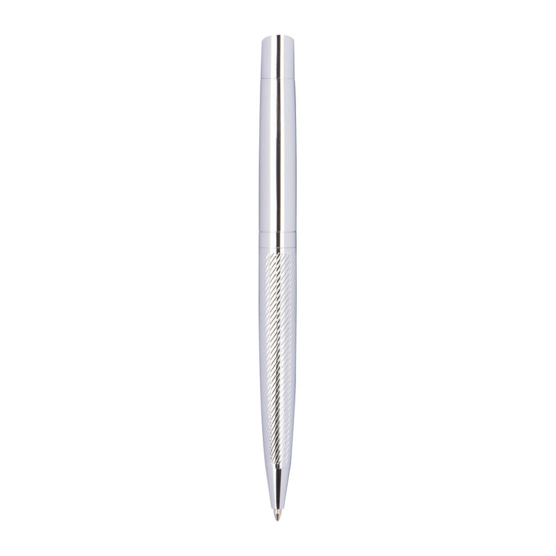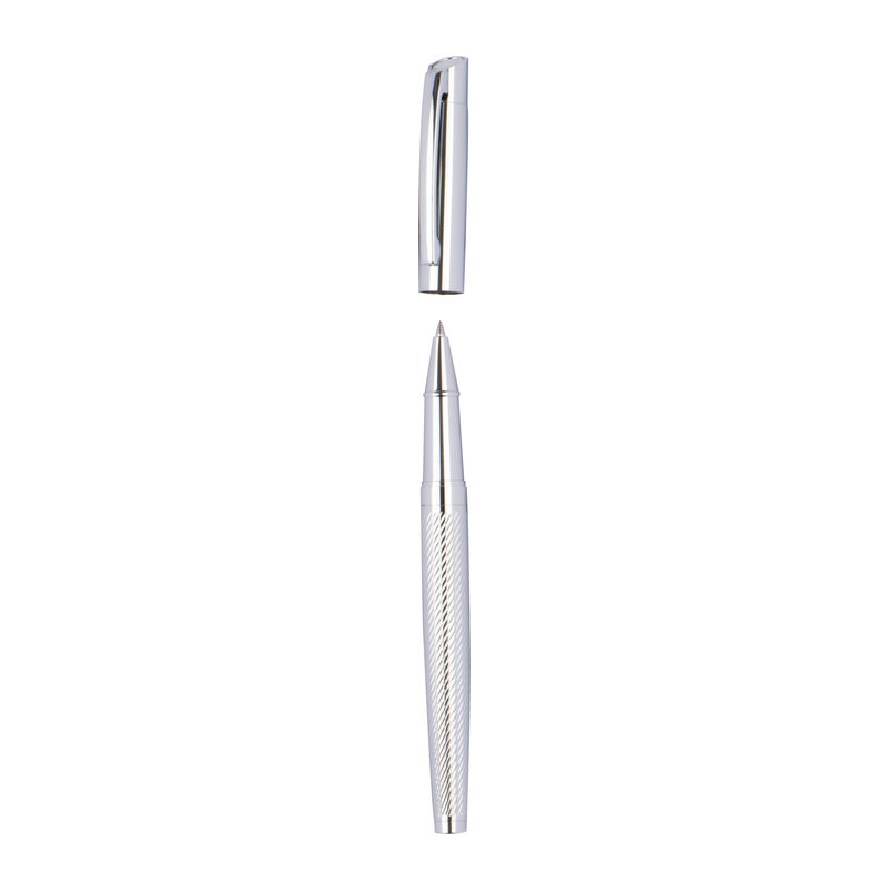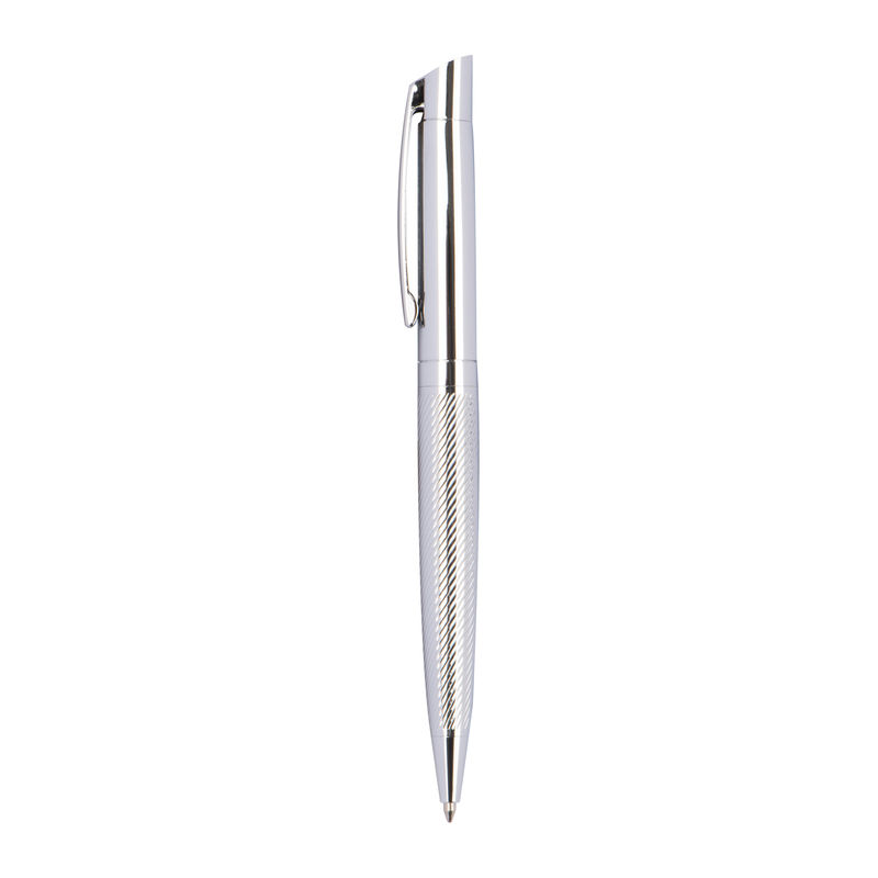 Writing instrument set consisting of a ball pen and a rollerball made of shiny chrome metal in black gift packaging. Both writing instruments write in blue. We will engrave your logo on both writing instruments next to the clip.