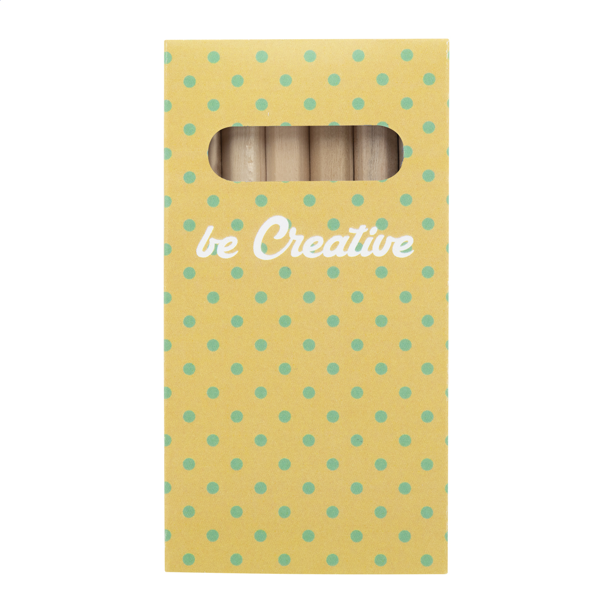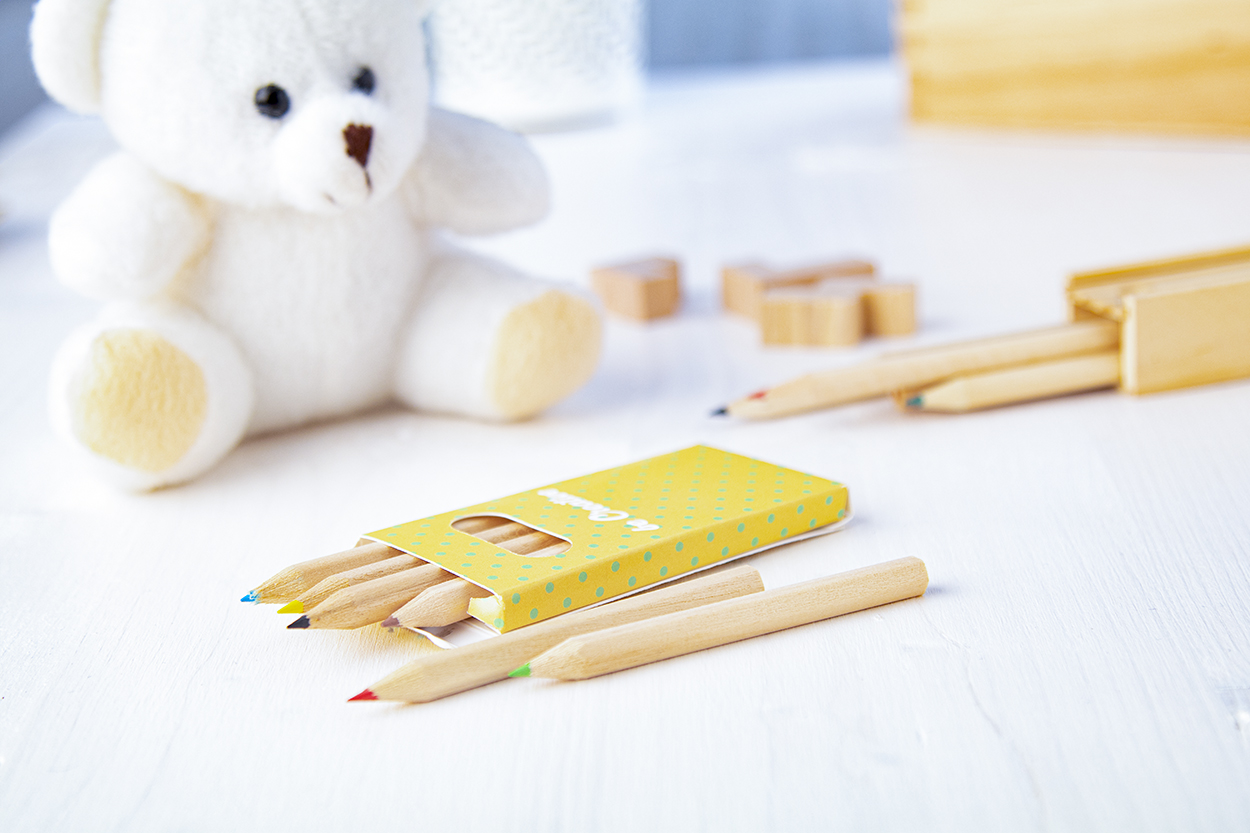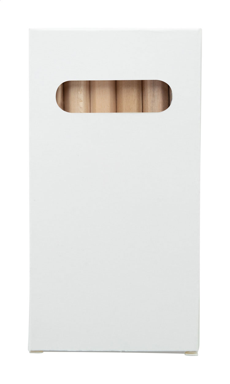 Wooden coloured pencils (6 pcs) in full colour printed paper box. Price includes digital printing. MOQ: 100 pcs.