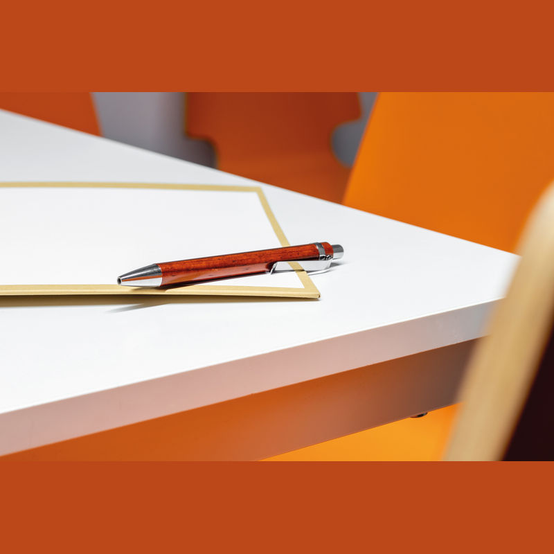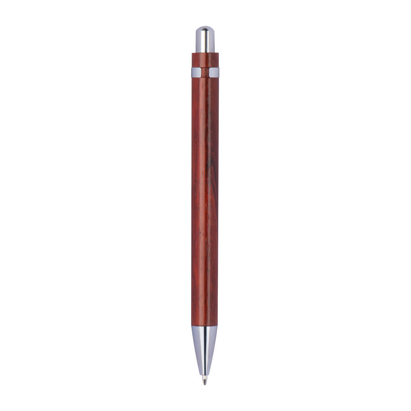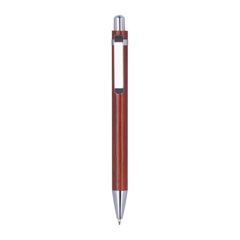 Ballpoint pen made of lacquered wood with a blue-writing refill and silver applications. Your logo will be engraved to the right of the clip.