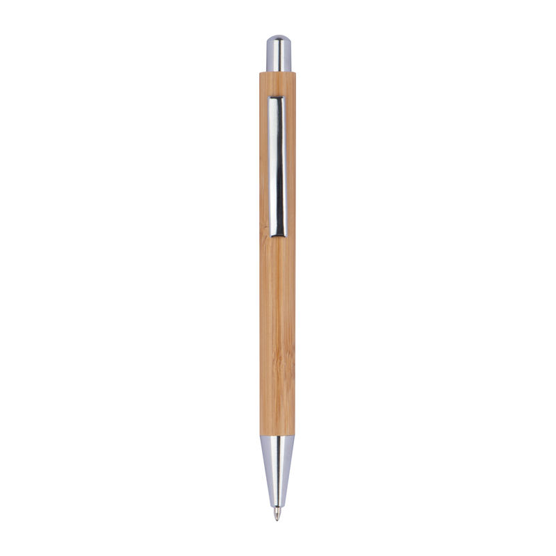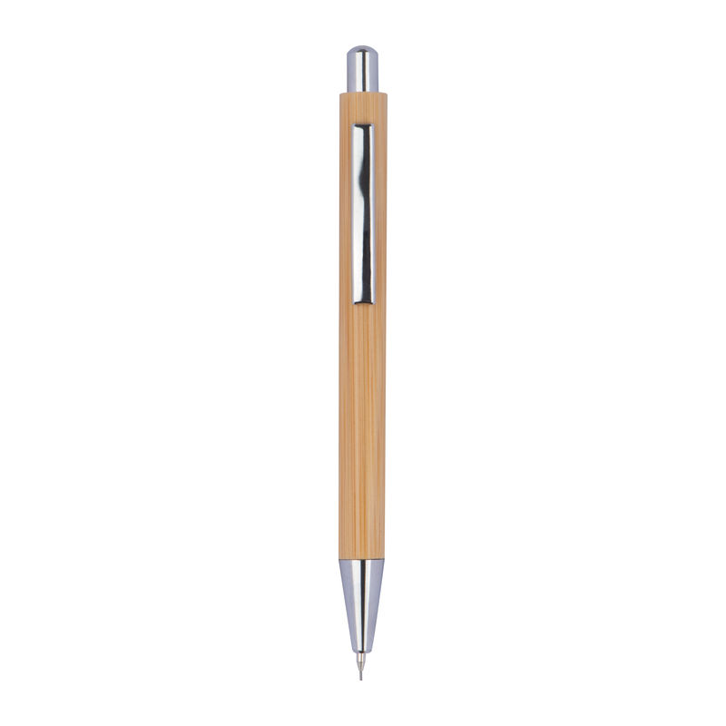 Writing set consisting of a blue writing ballpoint pen and a mechanical pencil made of bamboo with silver applications. The set is delivered in an environmentally friendly cardboard box.