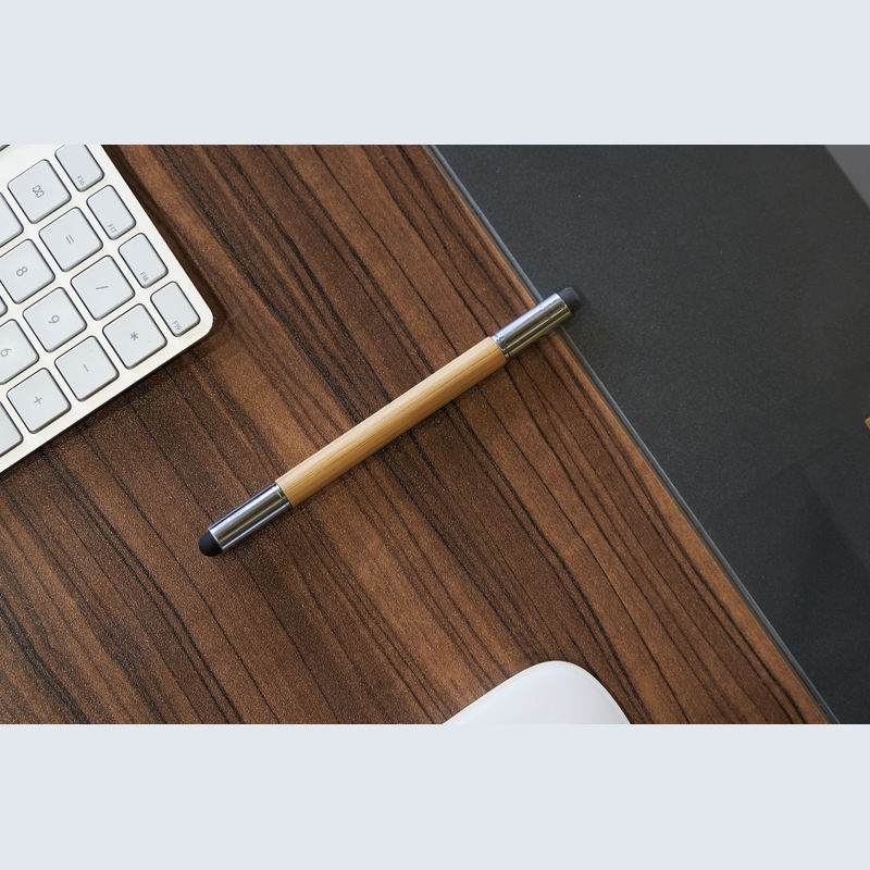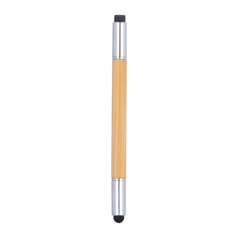 2in1 bamboo writing instrument consisting of a blue writing pen, touch function, an erasable endless refill and a matching eraser. Your logo is engraved on the writing instrument.