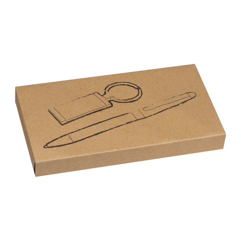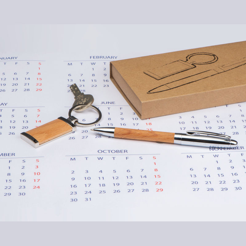 Gift set comprising a ballpoint pen and key ring, crafted in a sophisticated wood-metal combination.