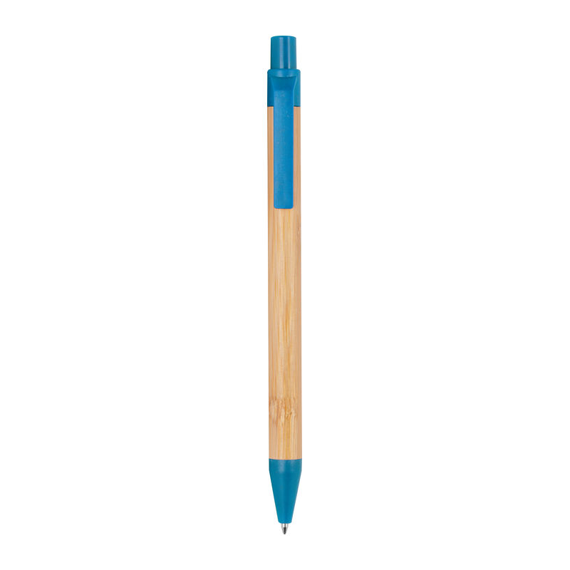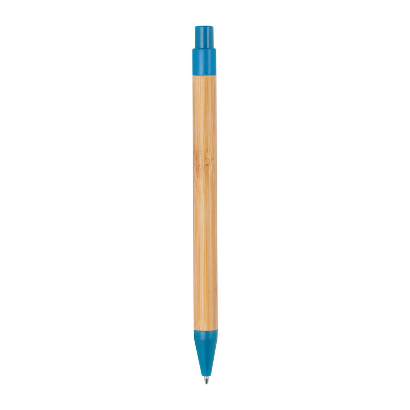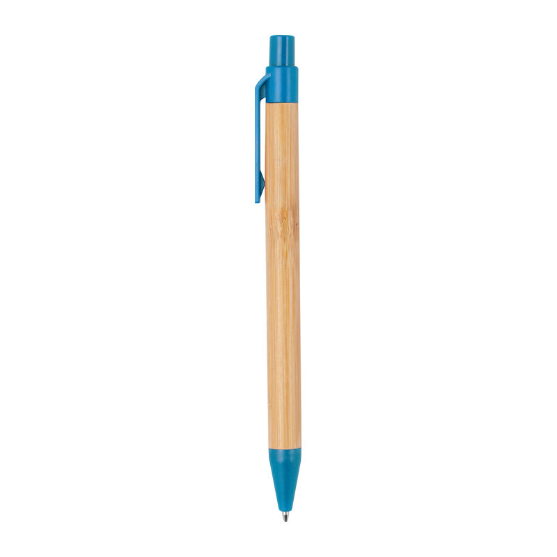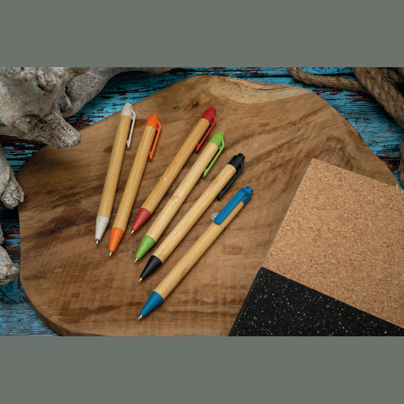 Retractable bamboo ballpen with coloured wheatstraw applications and a blue-writing refill. Your logo will be placed to the right side of the clip.